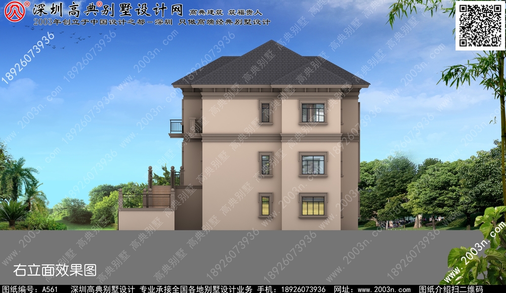 农村三层半别墅效果图首层221平方米图纸编号A561