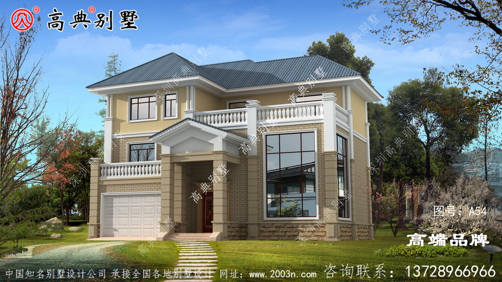 大灰色瓷砖搭配深蓝色屋顶,彰显时尚气息,简约实用的现代风格元素,与周围环境兼容,外观非常耐看。而且这款别墅施工不难,连普通农村施工队都很可以容易建。