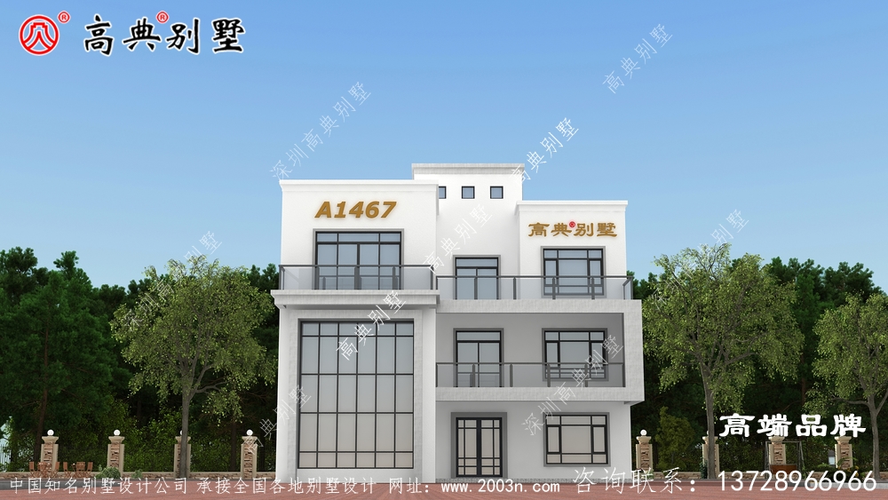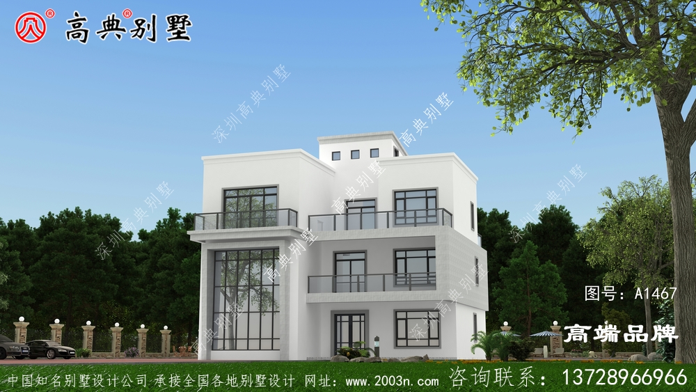 此别墅为独栋三层复式别墅,外饰用灰白色面砖,一楼有入户门厅,二楼有阳台,三楼有露台,这是很多农村朋友喜欢房户型,时尚简约又不失气质的别墅造型。